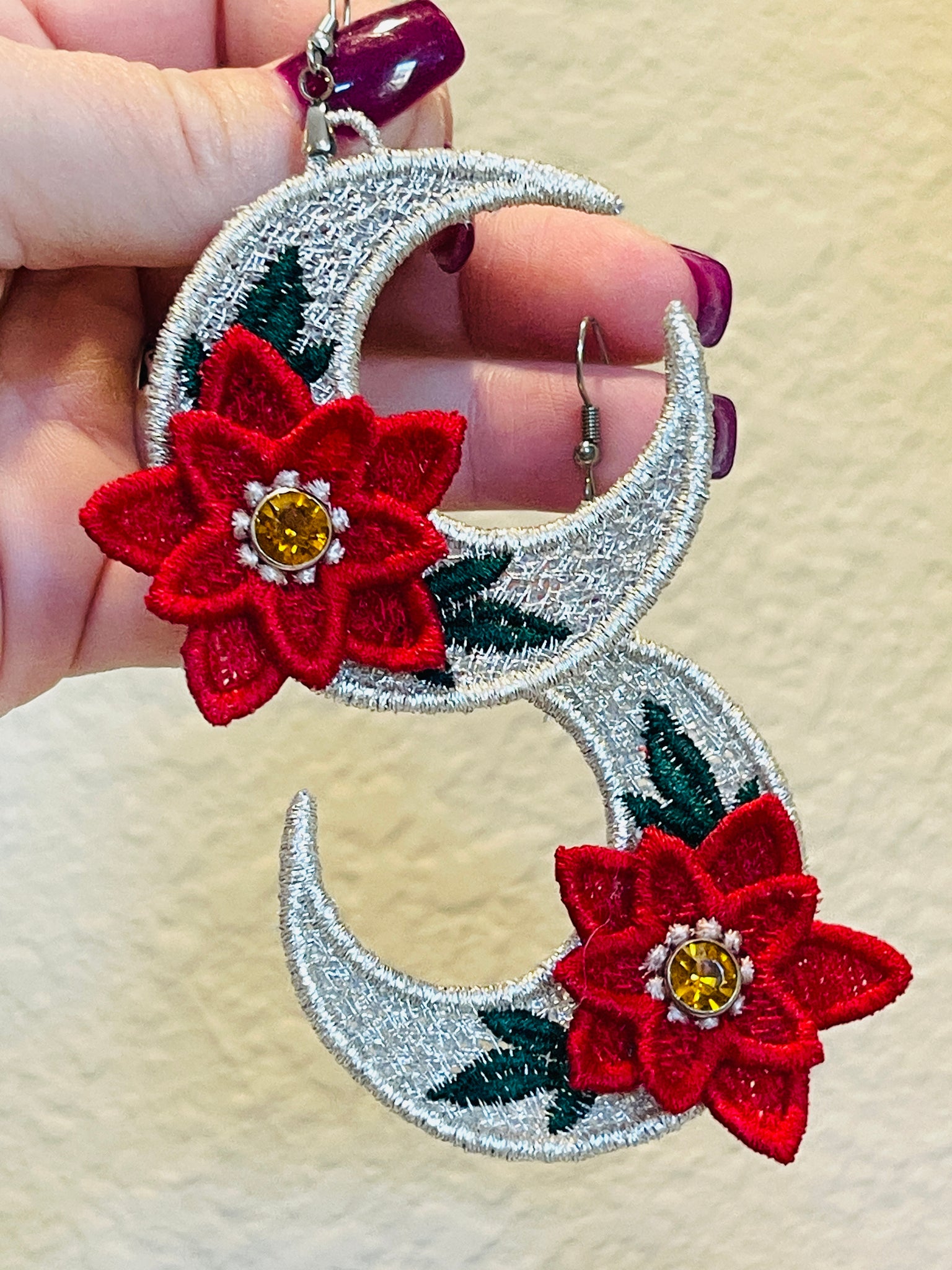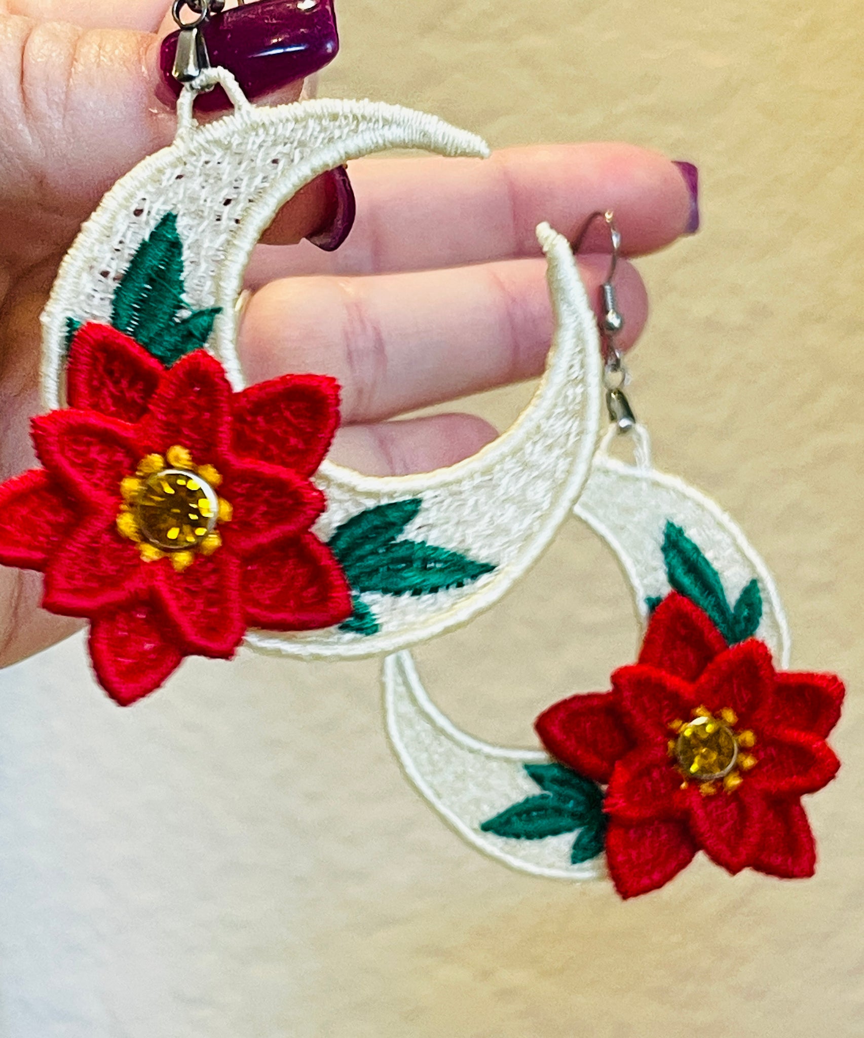 Poinsettia Moon FSL Rivet earrings are each 2.46" tall. Each file (left and right side) is 3.75" wide x 2.75" tall with 11239 stitches.
